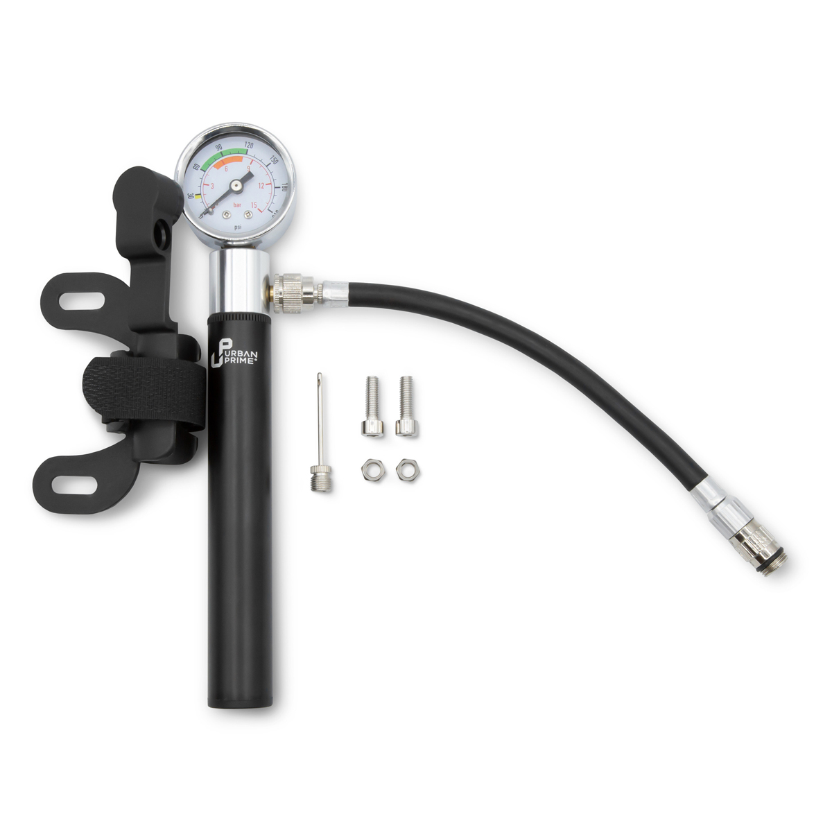 La pompa a mano Urban Prime con manometro ha una pressione massima di 210 PSI e permette di gonfiare in modo semplice ed efficiente tutti gli pneumatici. Grazie all’adattatore 2 in 1 già collegato al tubo della pompa è possibile gonfiare sia pneumatici con valvola Schrader che Presta.